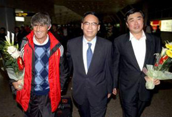 10月21日,中國足球隊結束世界杯足球預選賽亞洲區十強賽最後一場比賽後回到北京。中國隊以8戰6勝1平1負的戰績,第一次打進世界杯足球賽決賽。這是中國隊主教練米盧、國家體育總局副局長李志堅(中)、中國足協副主席閻世鐸(右)走出首都機場。