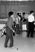 在現場還有很多年紀很大的殘疾人也來參加應聘,患小兒麻痹而癱瘓的42歲的許文英就是其中一位,她說,她找了20年的工作從來沒有人用過她,現在孩子上學家庭生活困難,她非常需要一份工作養家餬口,所以她明知道自己沒有學歷,仍趕到招聘現場想碰碰運氣。