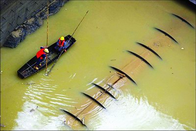 | 昨日下午,兩位工人用小船和竹竿搜尋4名失蹤民工 |