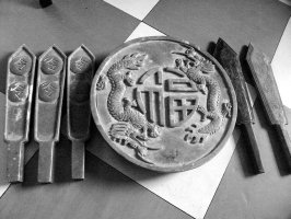 金先生用布小心翼翼地擦拭着六件外形獨特的物品,這六件物品都是石制的。其中最大的是一個石鼓。石鼓的一面刻着兩條龍和一個“福”字,另一面雕刻着八卦和陰陽魚的圖案。這個圓形石鼓直徑爲26釐米,高約4.5釐米,重量至少在5公斤以上。另外五件物品全部是令牌形狀,其中三枚長27釐米,高3釐米左右,一面雕刻着龍鳳圖案,另一面有兩個醒目的“令”字。另兩枚令牌的上部呈扁平狀,長30釐米,一面雕刻着一條龍,另一面雕刻着一隻鳳,顏色分別爲黑色和綠色。這六件石器上的花紋似乎都是手工雕刻,外觀基本完好,只是石鼓上有一道裂紋。