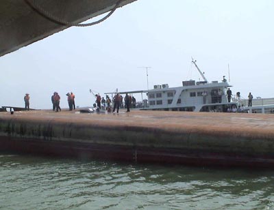 | 翻覆的運沙船底朝天,救援人員正在組織施救 |