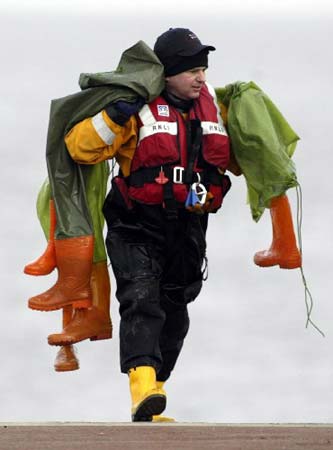 | 救援人員將找到的遇難者的防水服送上岸。 |