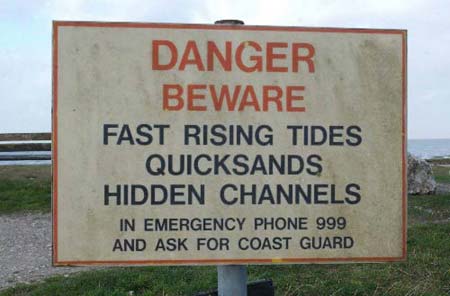 | 英格蘭西北部莫克姆灣海灘豎起了一塊警示危險的標牌。 |