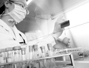到達實驗室後,工作人員立即將標本液接種到對流感病毒非常敏感的狗腎細胞和只有9至11日齡的雞胚上。24小時後,實驗室的工作人員開始關注細胞的變化情況,這個變化的過程一般要在96小時內才能全部完成。在生化培養櫃裏,流感病毒的“家”是一個個扁扁的玻璃瓶子,裏面盛着粉紅色液體。瓶子都是橫着放的,工作人員神祕地說,病毒細胞和狗腎細胞都長在瓶壁上。說着,她把這個盛着病毒的瓶子放到顯微鏡下面,記者隨即看到了許多小圓球,有的已經從瓶壁上脫落下來,漂浮在液體裏。工作人員說,這就說明裏面有病毒,因爲沒有病毒的狗腎細胞應該連在一起粘浮在瓶壁上。