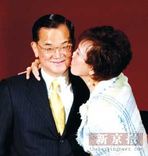 連戰在北大的演講結束後,夫人上臺獻上了溫馨一吻。