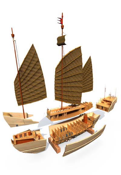 現復原的鄭和二千料海船爲福船型,外形爲小方首,寬平艉,有虛梢,兩頭翹。建築形式屬樓船,高艦樓階臺式3層,長舯樓1層,短艄樓開式2層.全船設上甲板(即主甲板),下甲板和底平臺三層縱向平臺。自艏向尾設17道橫隔壁,構成明代木帆船的典型橫式結構.井分割成各種工作、生活、儲藏艙室.充分顯示我國古代在造般技術上所創透的水密橫隔壁的結構特徵。