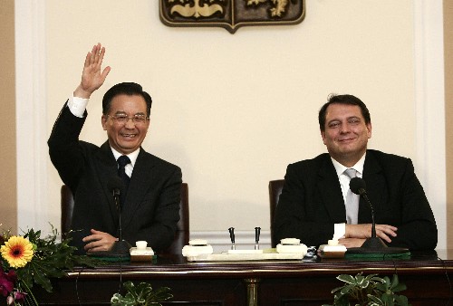 12月8日,中國國務院總理溫家寶在布拉格總理府與捷克總理帕勞貝克共同會見記者。