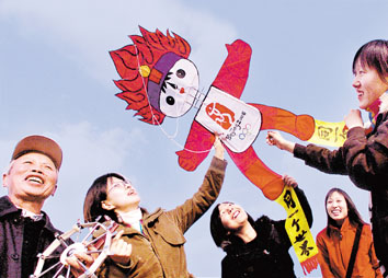 昨天,河西區居民劉寶民新近製作的福娃風箏飛上天空。這面精緻的風箏是老人蔘照本報刊登的奧運吉祥物五福娃中歡歡的形象,放大至1.4米後精心製作而成。