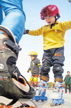 昨天氣溫回升,在戶外活動的人們多了起來。圖爲銀河公園裏孩子們在教練的輔導下學習滑旱冰。