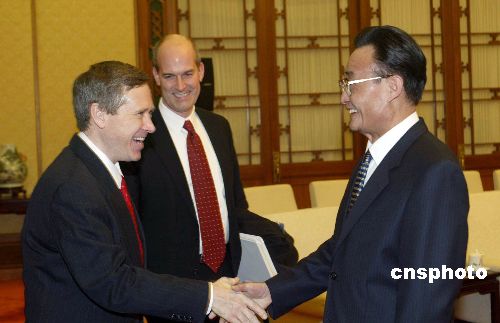 一月十日,中國全國人大常委會委員長吳邦國在北京人民大會堂會見由柯克(左)率領的美國衆議院美中工作小組代表團。 |