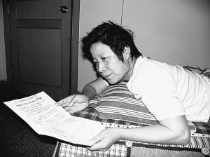 臥病在牀的遇難礦工家屬王愛珠在向記者陳述情
