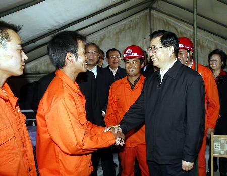 在修建青藏鐵路的過程中,10多萬築路大軍抗缺氧、冒嚴寒、頂風沙,付出了巨大的努力,涌現出許多可歌可泣的事蹟。胡錦濤一直牽掛着青藏鐵路建設者們。離開玉珠峯車站後,他又風塵僕僕來到位於格爾木的中鐵二十一局集團有限公司青藏鐵路項目部駐地,親切看望、慰問青藏鐵路建設者。