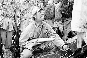 電影《萬水千山》中紅軍戰士相互攙扶,艱難越過水草地。