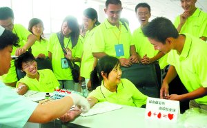 上午9時許,一輛大巴車駛進市血液中心大院,32名身着綠色T恤衫的青年男女走下大巴。大家相互鼓勵着,希望能通過體檢。大家領取無償獻血報名表後,體檢隨即開始。經過有無傳染病檢測、血型、血糖、血壓等檢查後,醫生向17名體檢合格者表示了祝賀。