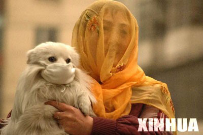 3月10日,在哈爾濱市街頭,一位戴紗巾的女士給小狗也戴上口罩防塵。從3月9日開始,我國北方發生入春以來第一次大範圍沙塵天氣過程。 新華社發