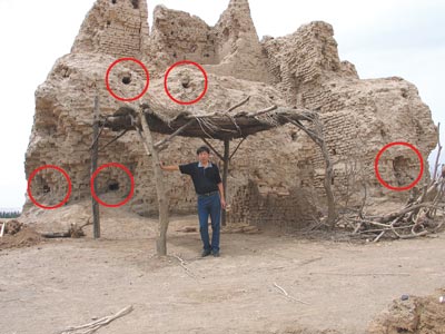 1、網絡上流傳的圖片中紅圈所標明的損壞位置與事實不符,由於該遺址距今有一千多年的歷史,稍有歷史知識的人都會了解類似建築搭建時可能是留下的木頭支架因年代久遠自然腐朽而造成的空洞現象,與我方並無任何關係;