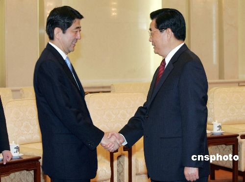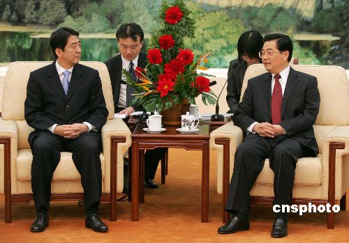 國家主席胡錦濤8日下午在人民大會堂會見了日本首相安倍晉三。
