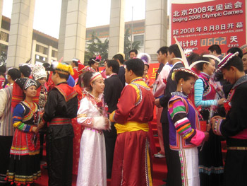 今天的天安門廣場喜氣洋洋,奧運倒計時牌前更是花團錦簇、彩旗飄飄,迎來了一批特殊的客人——來自全國35個民族的56對新婚青年,在這裏舉行了隆重熱烈的集體婚禮。據瞭解,在天安門廣場奧運倒計時牌前舉辦青年集體婚禮在國內尚屬首次。