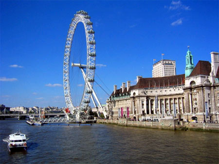座落在倫敦泰晤士河畔的“倫敦眼”是倫敦最有吸引力的觀光點。高135米的“倫敦眼”是爲了慶祝千禧年而興建的,自2000年3月開放之後,已經有超過850萬人次乘坐“倫敦眼”升上高空,鳥瞰倫敦。“倫敦眼”也是英國最受歡迎的付費觀光點。