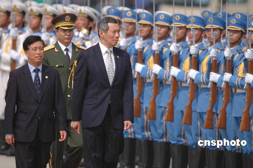 圖爲李顯龍檢閱中國人民解放軍三軍儀仗隊。