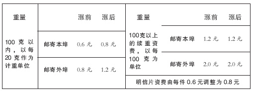 根據這一通知,信函資費首重100克以內,每重20克本埠由0.6元調整爲0.8元,外埠由0.8元調整爲1.2元;100克以上的續重資費維持每重100克本埠1.2元、外埠2.0元不變。明信片資費由每件0.6元調整爲0.8元。