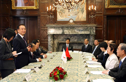 4月12日,正在日本進行正式訪問的中國國務院總理溫家寶在東京會見日本衆議院議長河野洋平。