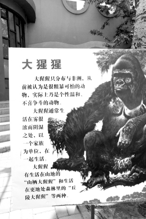 昨天9:30,天津動物園大猩猩館前的大猩猩習性說明牌前,一名十來歲的女孩面帶疑惑地問道。聽到這樣的“怪問”,隨行的老奶奶順着女孩手指方向看去,只見牌子上印有這樣一段話:“幼年大猩猩在3歲前尾巴上有一醒目的白貓。”原本應該是“白毛”卻寫成了“白貓”,難怪女童會鬧不明白。