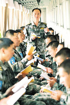 9時,政治教育時間。我從參演部隊政工組人員提供的計劃表上看到,今天進行的是“樹良好形象爲軍旗增輝”教育課,授課人是參演部隊第一梯隊政委林長青。因車廂空間狹小,授課以連爲單位組織實施,林政委分頭到每個車廂串講,各單位組織討論,氣氛十分活躍。