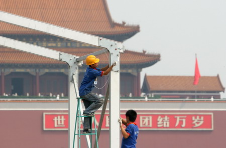 8月3日,工人在天安門廣場搭建北京2008奧運會倒計時一週年慶祝活動的設施。