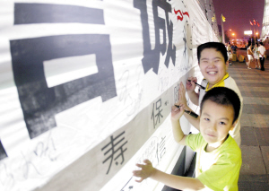 長卷簽名祝福北京奧運是“2008天津‘福’娃在行動”活動的最後一個重頭戲,2008個小“福”娃按照不同的進場順序,在工作人員的指引下,將字斟句酌的祝福語,莊嚴的寫在長卷之上。許多家長表示:雖然活動過程很短,但意義非凡。