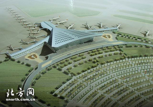 | 天津機場新候機樓俯視全景效果圖 |