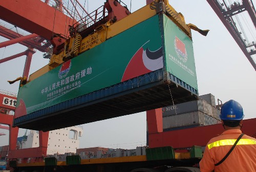 這批援助物資包括越野車、救護車、血壓計、多功能手術牀等醫療器械和40套活動板房等,總重量1523噸,共計190個集裝箱。這些物資總價值約4000萬元人民幣。