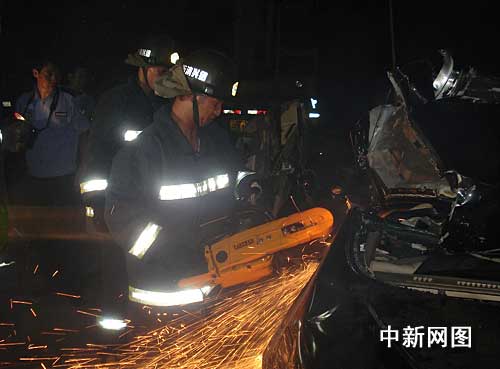 記者在現場看到,經相撞後的小轎車已經嚴重變形,前車蓋被衝擊力掀起,車頭嚴重內凹,擋風玻璃碎落一地,座椅上更是血跡斑斑。小轎車內原坐有四人,正副駕駛室座位內的兩人當場死亡,而後座的兩位傷者則被硬生生卡在車體中,身上多處傷口流血,並不時發出低沉的呻吟聲,情況十分危急。距該車一百米外的大貨車更是衝到了路基下面,所幸沒有人員傷亡。