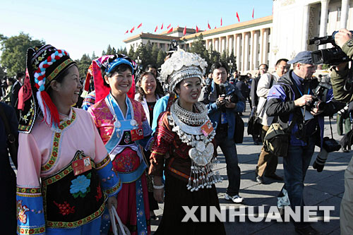 10月15日上午,中國共產黨第十七次全國代表大會將在北京人民大會堂開幕。這是記者在採訪代表。