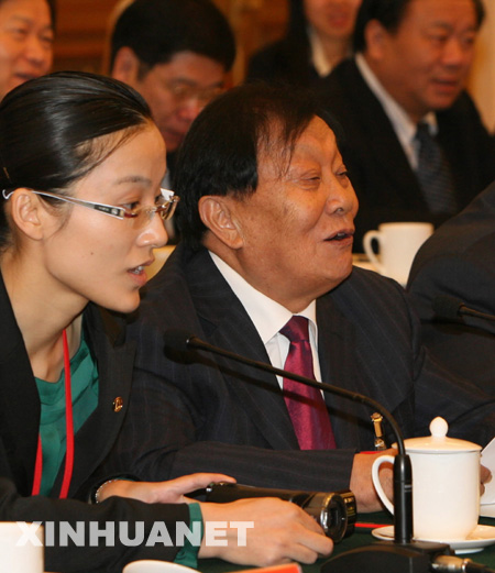 十七大代表、來自江蘇華西村的吳仁寶擔心他的地方口音難懂,帶來孫媳婦(左)做“翻譯”。他在發言中說,胡錦濤同志的報告農民聽得懂,村幹部好操作。