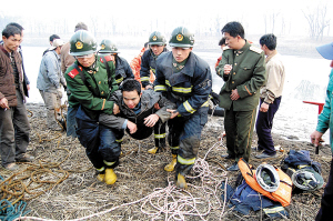 “快來人啊,有人落水了。”消防1中隊接到這樣一起報警電話,按照報警人所說,有兩名男青年不幸落入天津市新開河裏,隨時會被冰冷的河水吞沒。消防員趕到現場時,只見兩名男子上身趴在河中央位置的冰面上,下身則沉在水裏,倆男青年一動不動地趴着,或許他們自己也知道,只要稍微用點力氣,薄薄的冰面就可能裂開,他們就可能沉入水中。