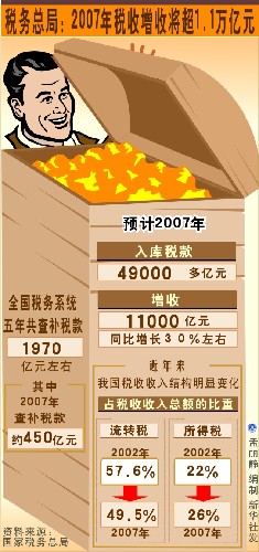 | 稅務總局:2007年稅收增收將超1.1萬億元 |