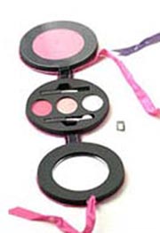 三色淺亮的眼影深桃紅色2克,淺粉紅色2克,白色2克,還有一個眼影刷和一個細小的粉刷。眼影立體感強,顏色自然可愛。腮粉6克,比眼影的深桃紅色淺一點,絲滑如絲,臉部立刻光彩很多,紅暈的很自然,持久不脫色!配備鏡子,方便實用。盒子外面是玫紅色的緞面絲綢所包,華麗嫵媚同時可愛時尚,不用時可摺疊,把兩跟絲綢帶子打成一個蝴蝶結就行。