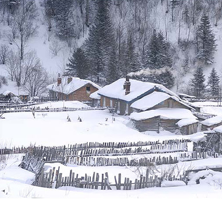 這裏絲毫沒有酷冷的蕭殺,觸目皆是繽紛美景。白雪隨風飄落,隨物具形,千姿百態。屋頂的積雪能厚至1米,由於風、陽光及晝夜溫差的綜合作用,屋頂上的雪一點點下垂,層層疊疊,一直拖到地上,就像大蛋糕上向下流淌的奶油,那令人擔心的厚度也彷彿使木屋茅舍不堪重負。