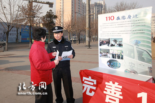 北方網消息(記者趙穎妍 通訊員趙永明 張易廷):2008年1月10日上午9時,天津市公安塘沽分局在塘沽區世紀廣場舉辦了“110宣傳日”活動,吸引了過往羣衆駐足觀看。活動中,民警熱心解答了百餘名羣衆的諮詢,併發放110宣傳材料1000餘份。