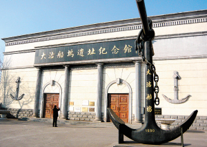 第一次來到北洋水師大沽船塢紀念館是走的水路,登陸後,穿越過大沽船塢原有的部分簡單陳舊的設備,就隱約看到了北洋水師大沽船塢遺址紀念館前的標誌性建築,一個高達5米的錨,劉春慶副館長介紹,錨是船和船廠的象徵,看到錨就會想到船。伴隨着沉重的大門打開時的吱呀聲,記者邁入了大沽船塢紀念館,映入眼簾的展品一下把思緒帶回到120年前,並揭開了中國100年前修造船的“祕密”。