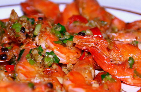 然後加入剛纔的蝦,拌勻後加入蔥花,起碟。