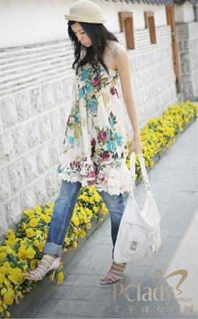 稍長的雪紡是臀部過於豐滿的MM的救星。下半身不管是牛仔短褲還是中長褲,只要是緊身的設計,就一定能與雪紡的甜美感完美混搭。