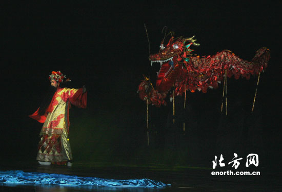 看完該劇後,給我留下印象最深的應該說是『十二生肖』中龍的形象,和其他屬相一看便知的動物形象相比,龍卻穿著一身紅底鎦金袍,袍服下擺以紅色勾金的層層布片來表現龍鱗;龍的臉上還帶著長長的黑色胡須,活脫脫一副京劇老生的扮相,每次他的出場都會伴有舞龍表演。此外,龍的圖騰還一直飄在劇場上方,舞臺上閃現的紅色剪紙等也不斷在向觀眾提示著劇中蘊含的中國元素。