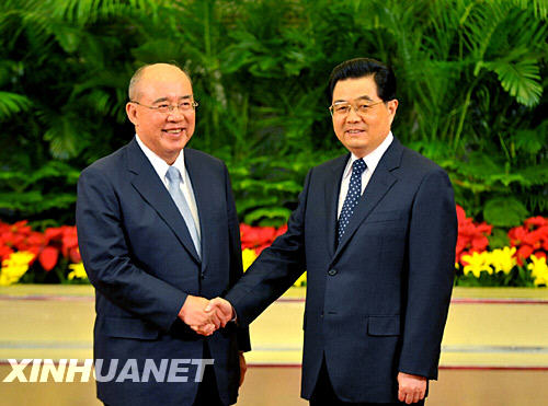 5月28日,中共中央總書記胡錦濤在北京人民大會堂迎賓廳會見中國國民黨主席吳伯雄和他率領的中國國民黨大陸訪問團全體成員。這是胡錦濤同吳伯雄親切握手。