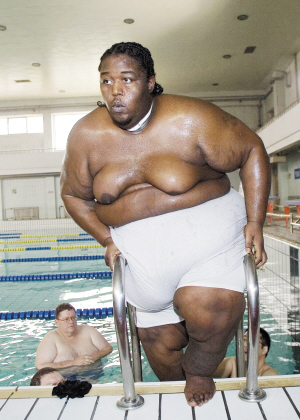 巨胖們不敢像其他游泳者那樣,一下子跳入水中,只好雙手扶著爬梯,背對泳池一階一階地向水裡走。這時,阿隆佐鬧出一個不大不小的笑話。他的臀部、腹部太寬,愣是一下子被『窄小』的扶梯卡住,由於雙腿已經浸入水中,無法用力再向上攀登,他只好松開一只手,深深吸一口氣,一下子扶在巨大的肚子上,用力向下按,一旁的醫護人員也趕緊過來幫忙,向皮膚與金屬扶梯接觸的部位潑水,纔幫他成功脫身。相比之下,體積小了一圈的安德森兄弟下水時則輕松多了。