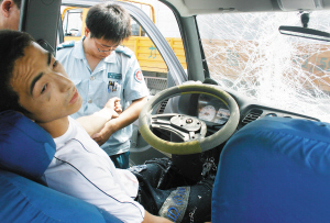 被卡住的司機已經神志不清。為了讓他保持清醒,本報司機趕緊跑回車裡拿來了一瓶礦泉水,一邊澆到了他的頭上,一邊呼喊著:『別睡,千萬別閉眼。』在大家的呼喊下年輕司機終於睜開了眼,大家馬上將他身下的坐椅放倒,讓他上半身能靠在坐椅上,並問出了他的家庭電話,通知其家人快到現場來。