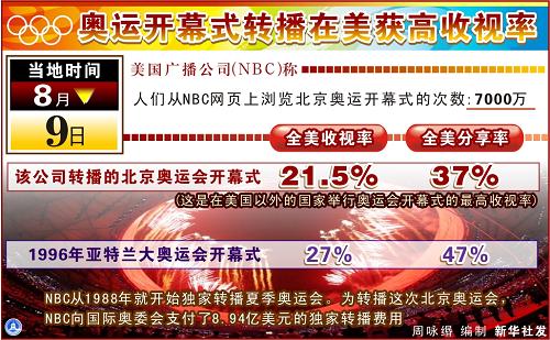美國全國廣播公司(NBC)9日宣布,北京奧運會開幕式節目在美國電視觀眾中深受歡迎,收視率達到21.5%,僅次於亞特蘭大奧運會開幕式的27%,超過了其他任何在美國以外舉行的奧運會開幕式。在NBC網站實時瀏覽北京奧運會開幕式的人次達到了7000萬。