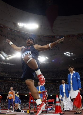 8月15日,美國運動員霍法在北京奧運男子鉛球決賽中跳起『街舞』