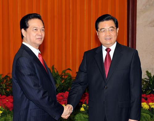 國家主席胡錦濤22日在人民大會堂會見來華進行正式訪問並出席第七屆亞歐首腦會議的越南總理阮晉勇。